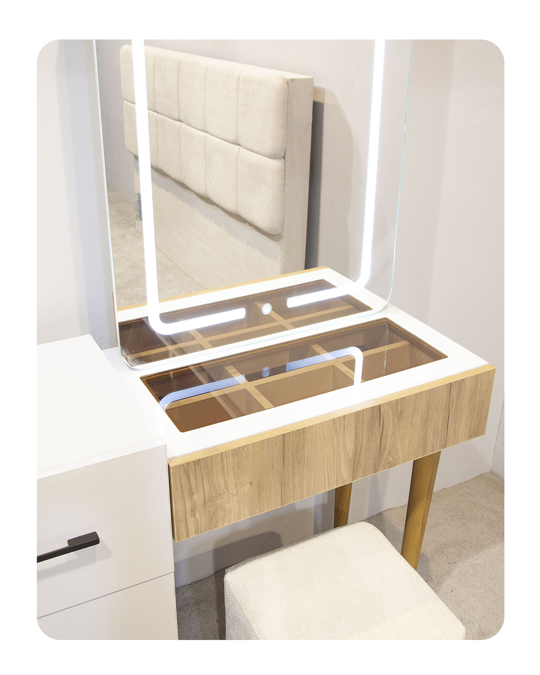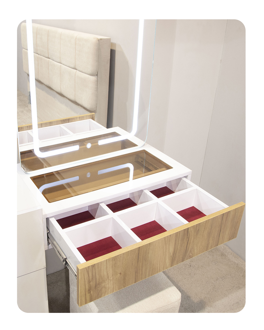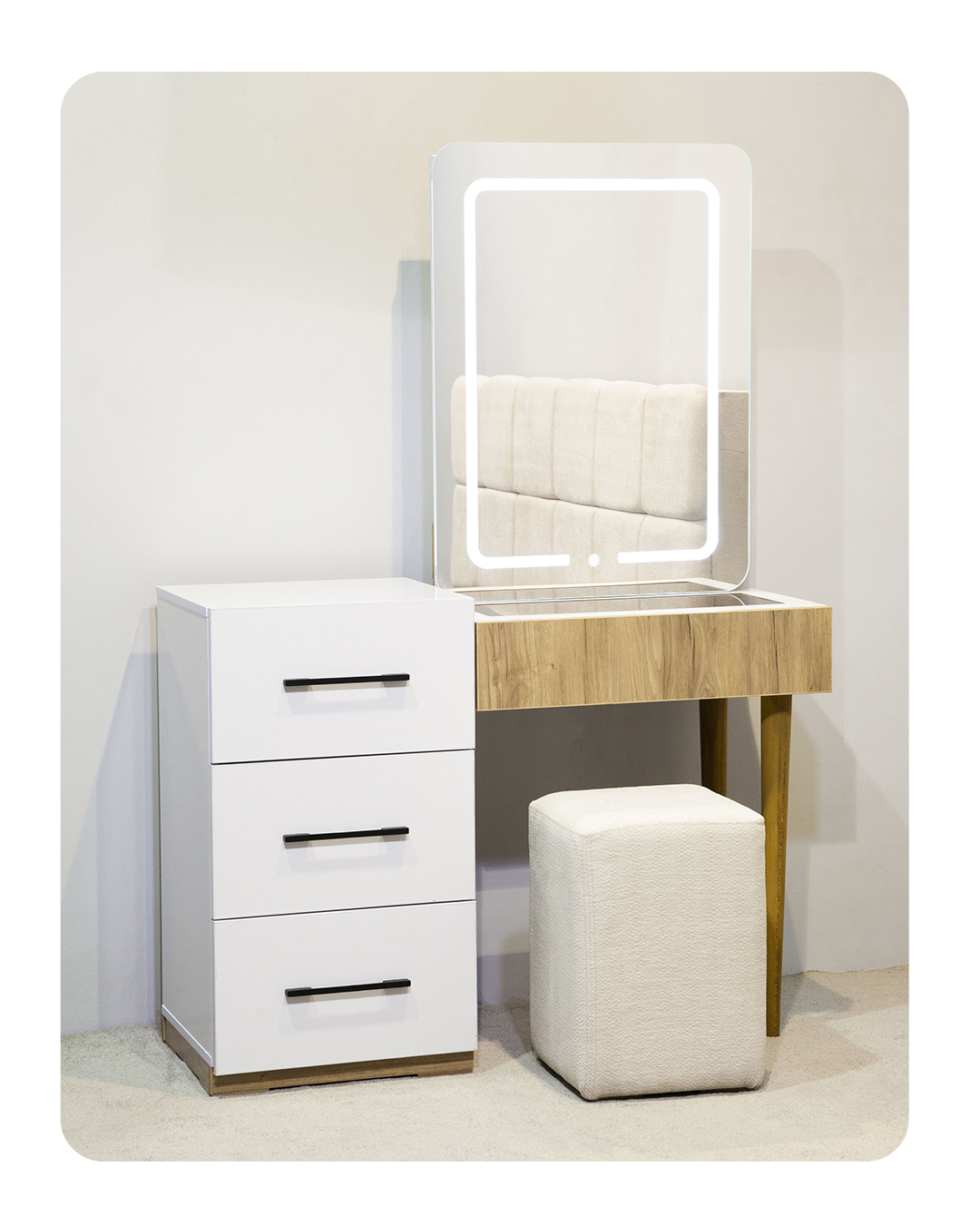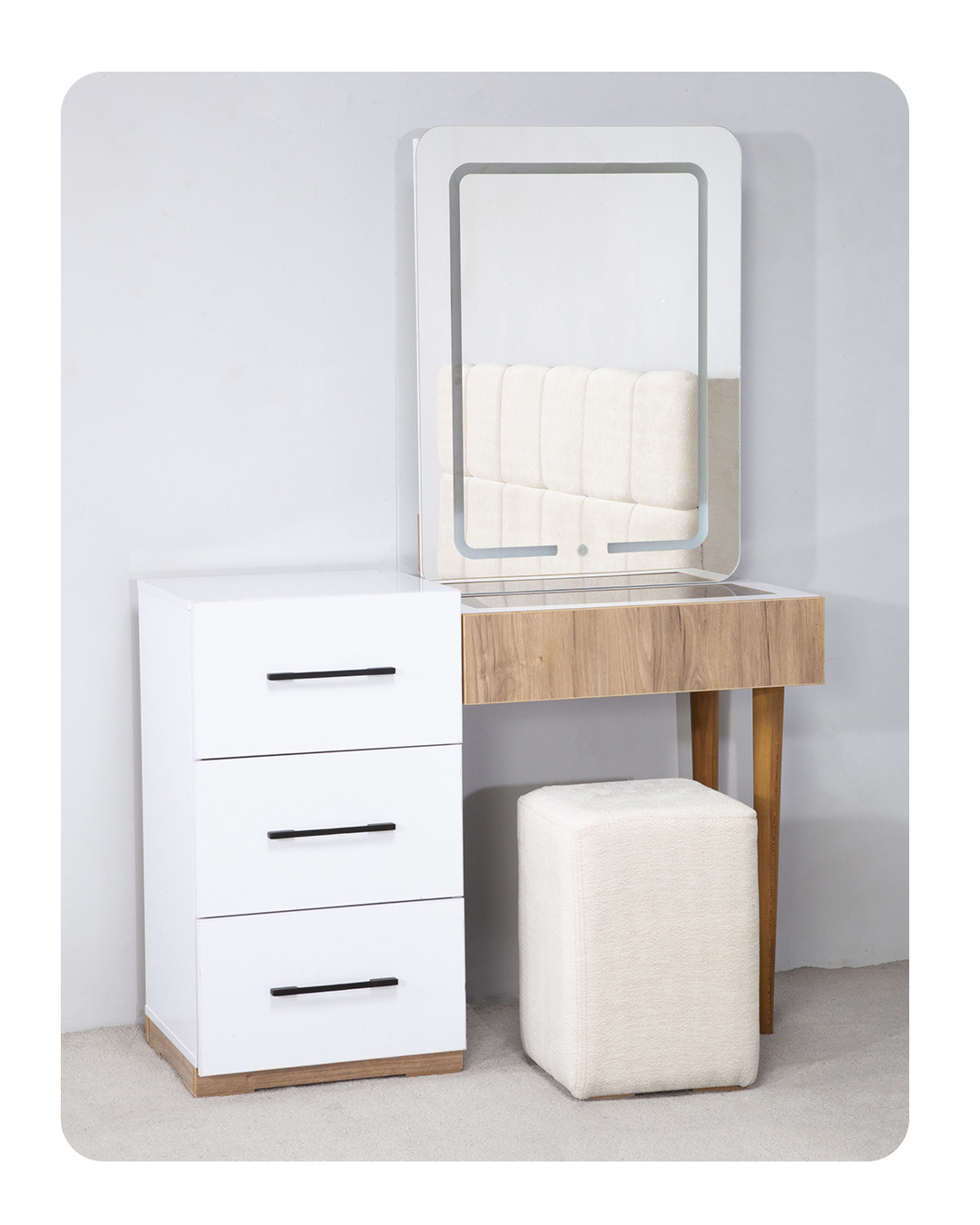 تمام ام دی اف MDF ساخته شده از بهترین مواد اولیه آینه و میز آرایش دارای رینگ لایت طراحی جدید و به روز بهترین و مرغوب ترین اتصالات