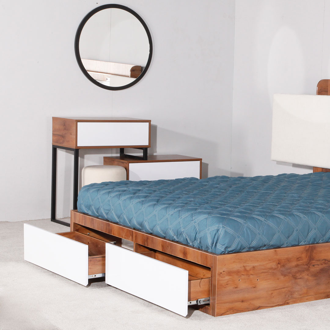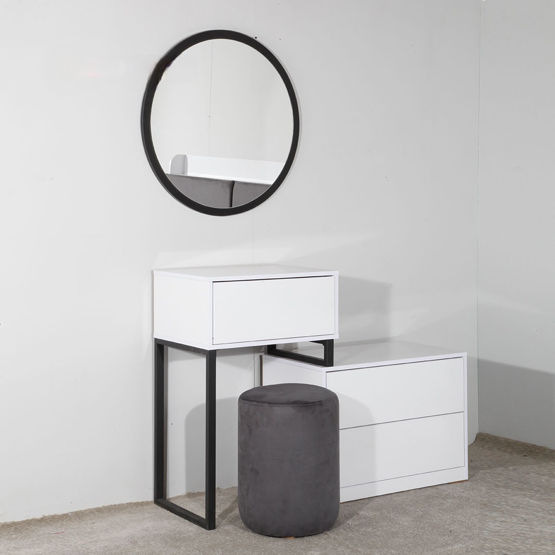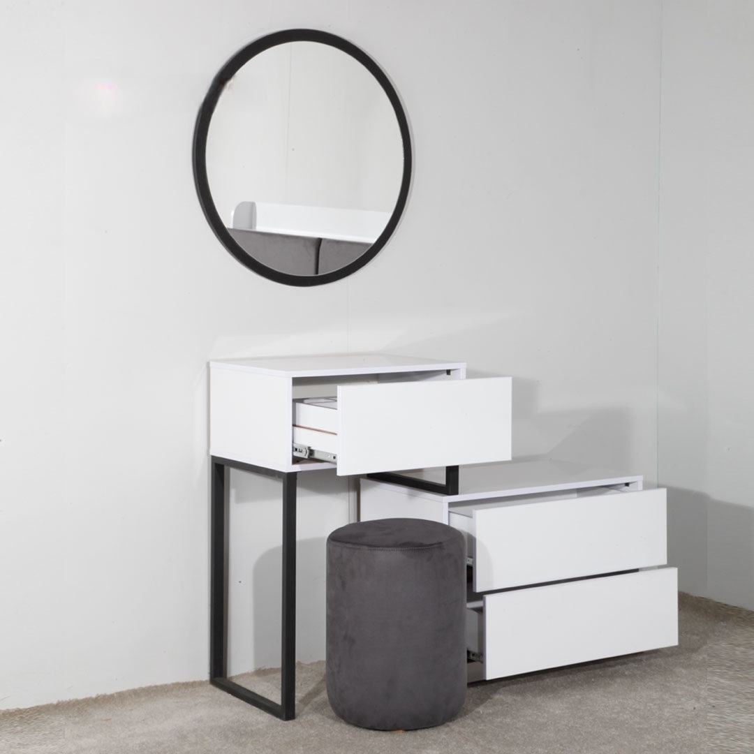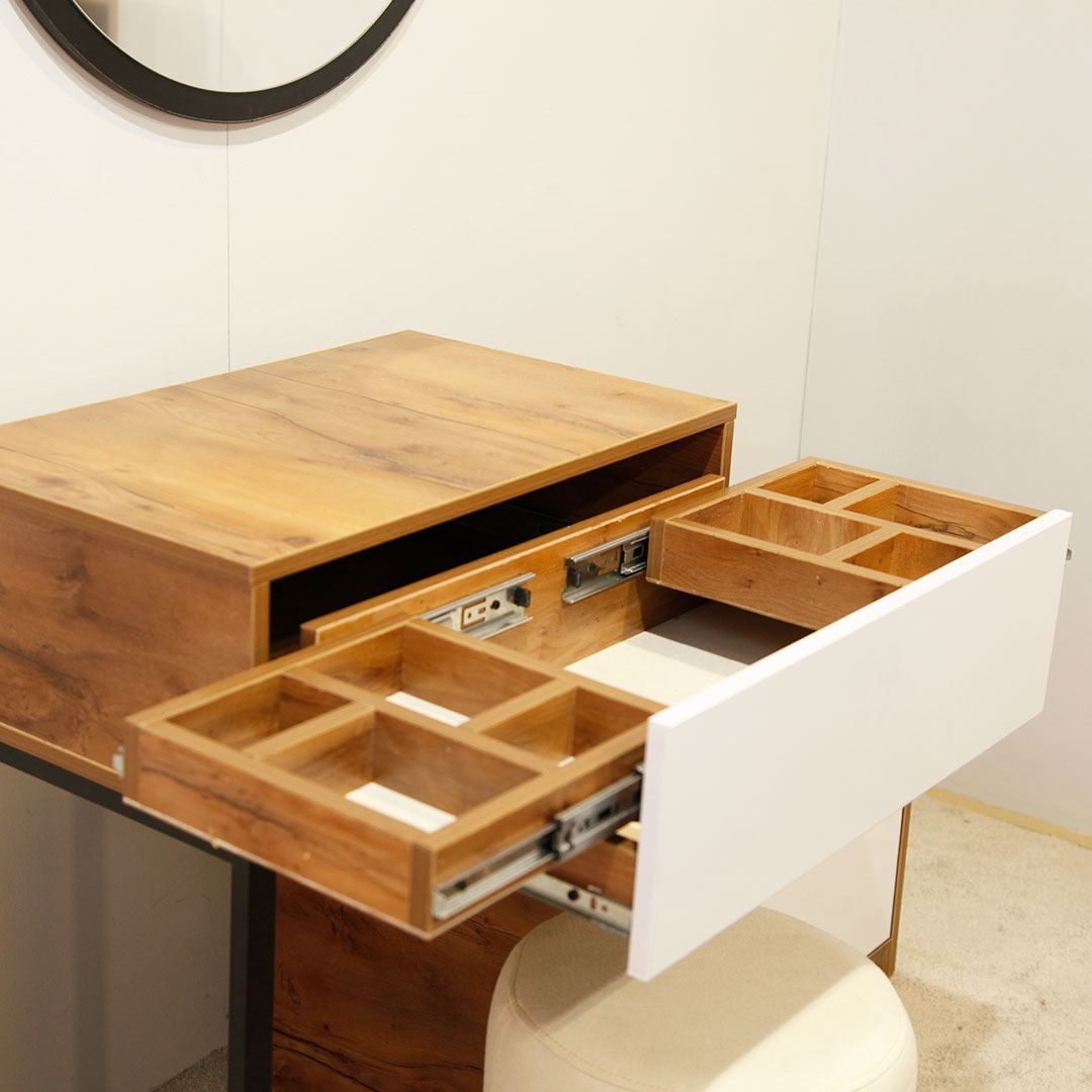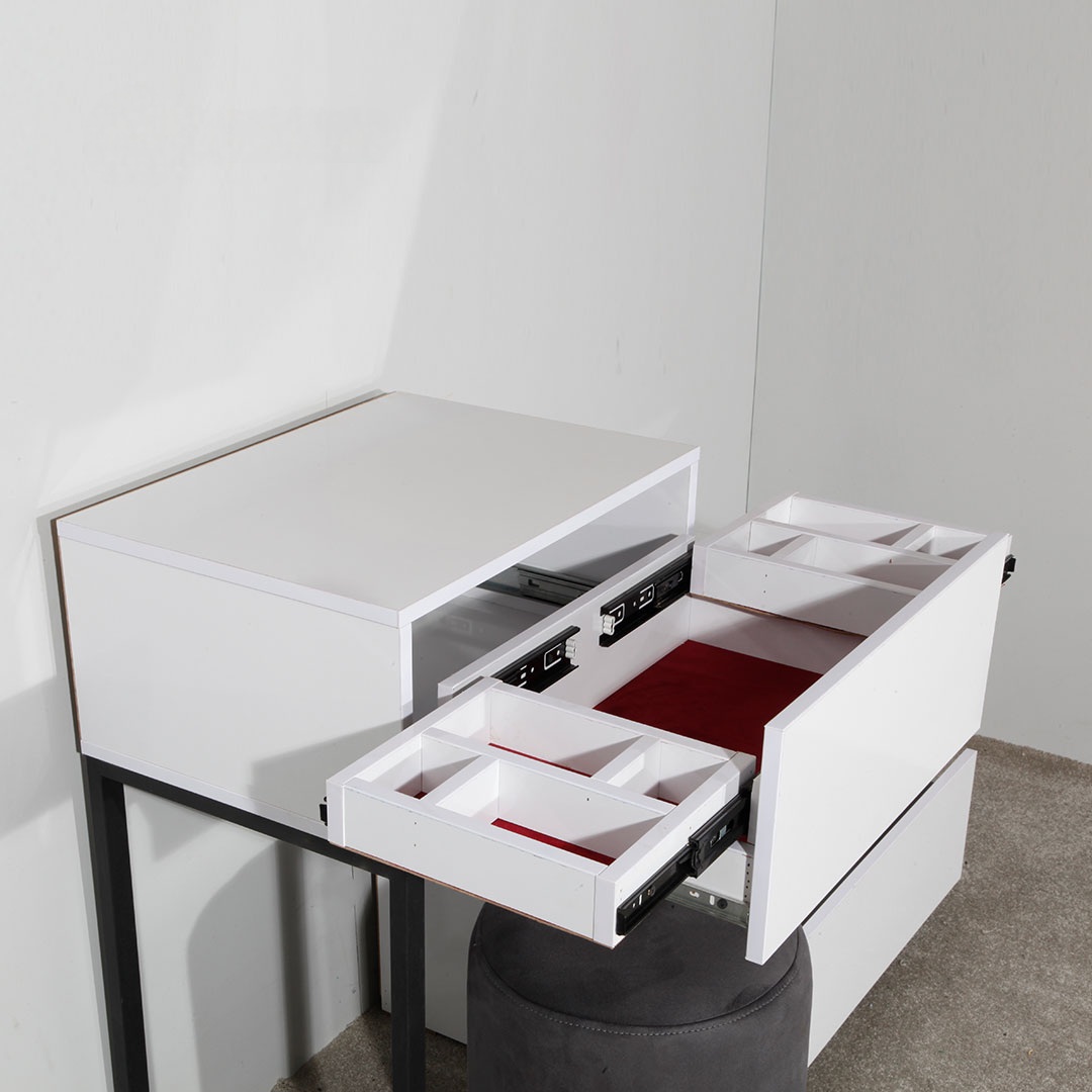 میز آرایش با قابلیت تنظیم ابعاد کشو اول میز دارای جعبه مخفی جواهر عسلی مبله تمام ام دی اف ساخته شده از بهترین مواد اولیه طراحی جدید و به روز