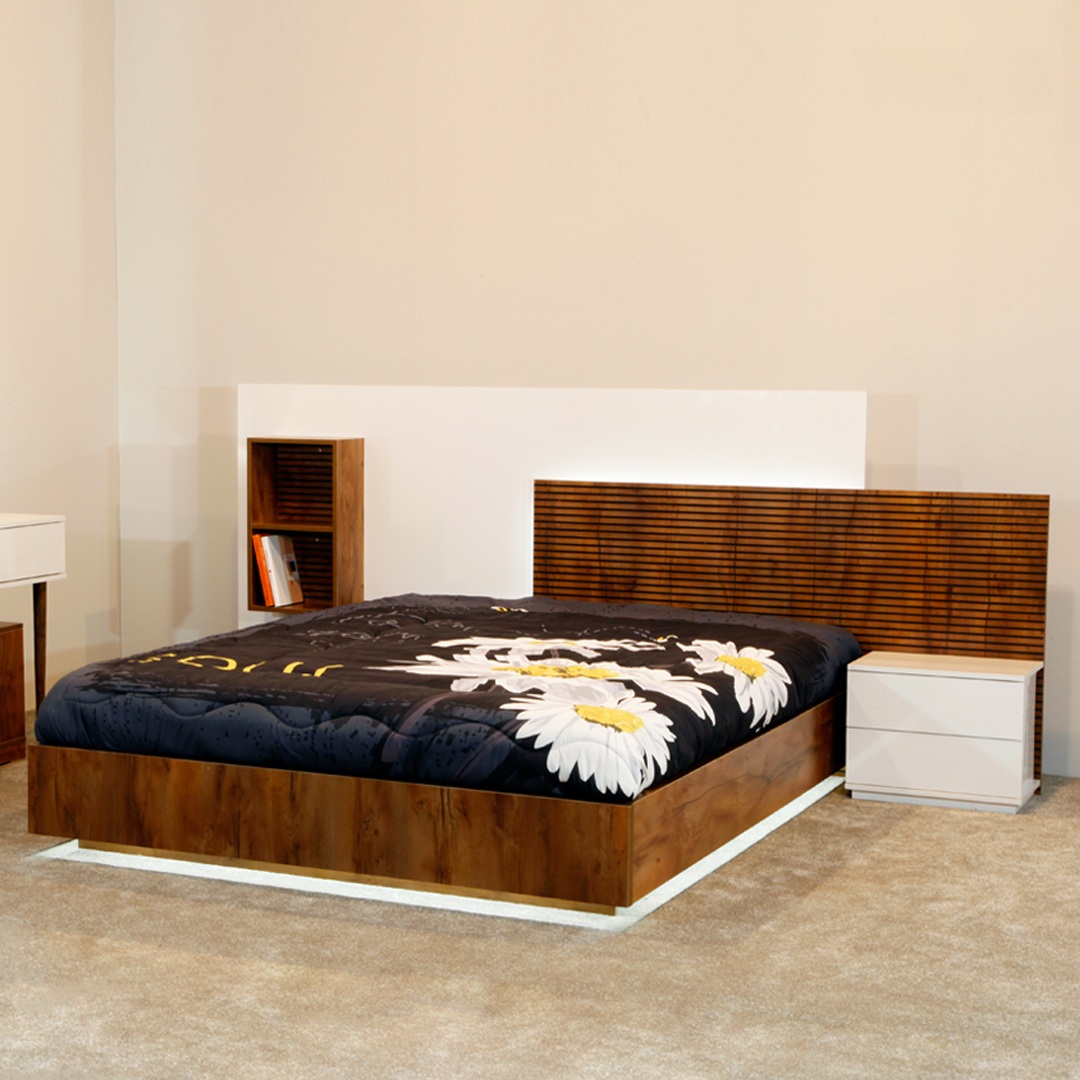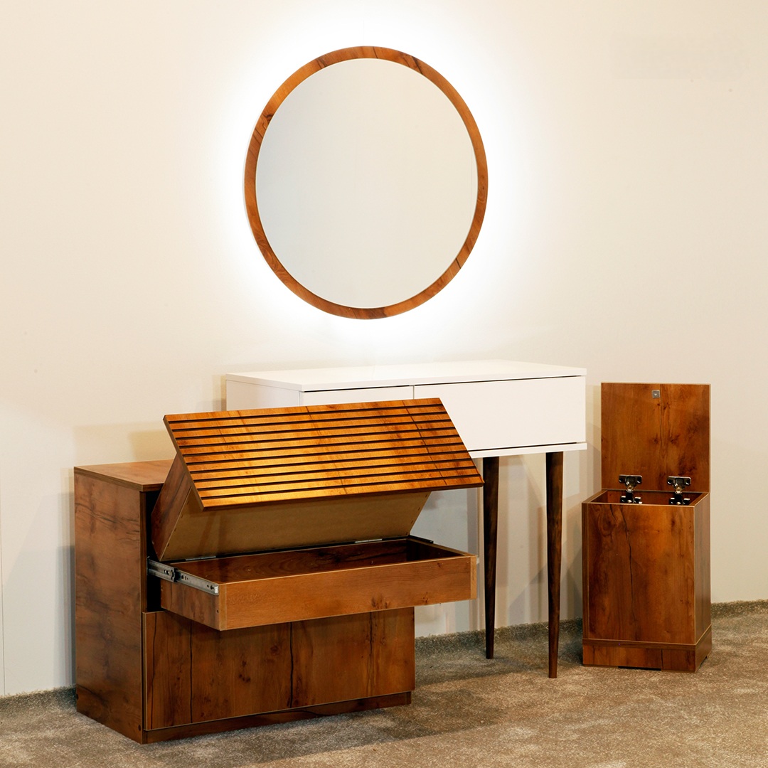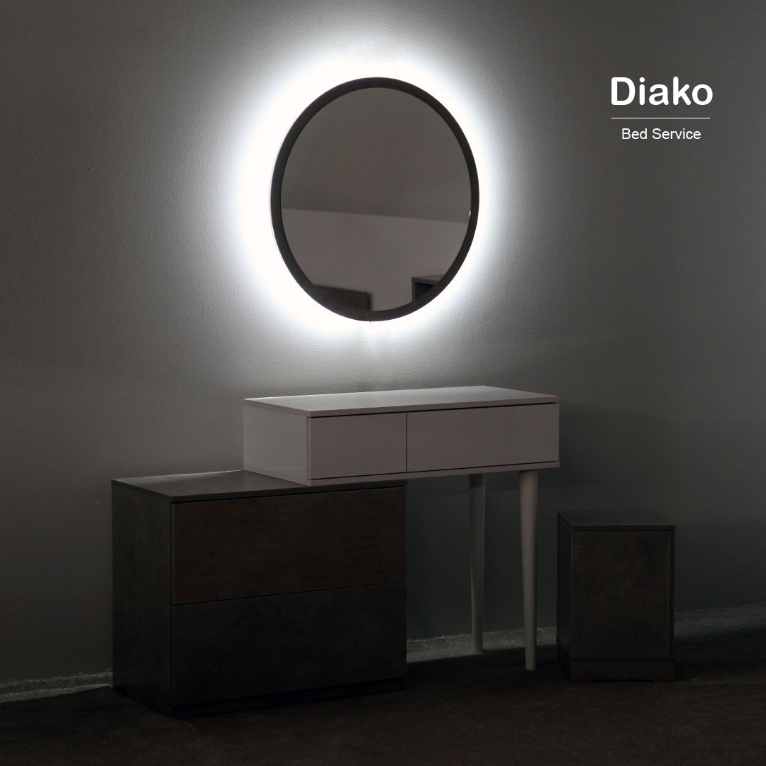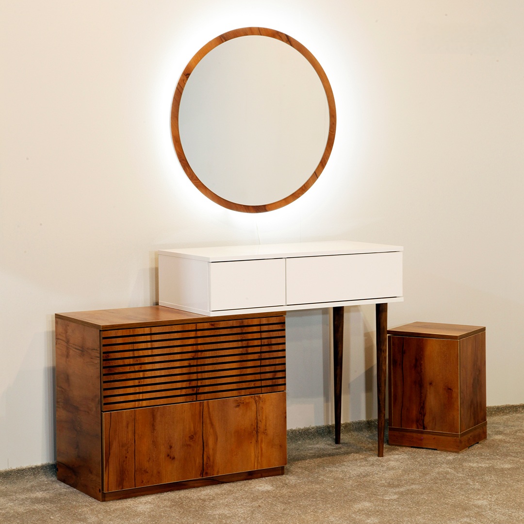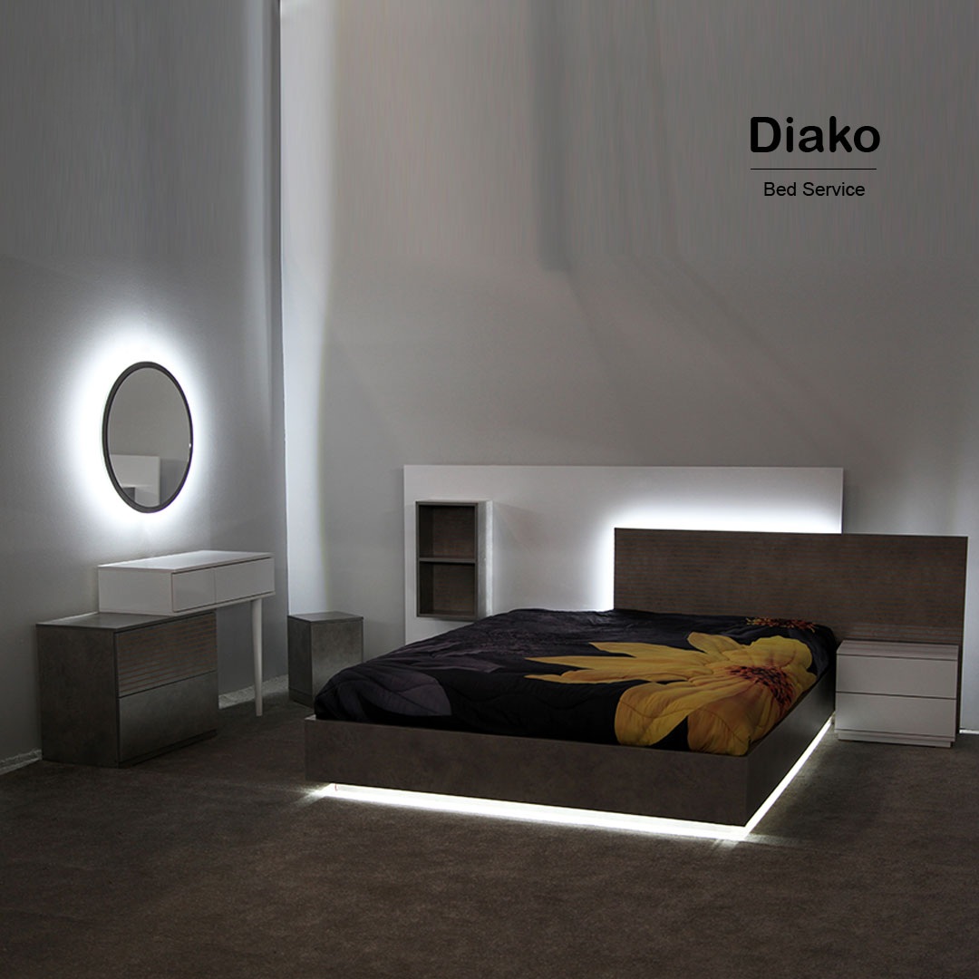 تمام ام دی اف MDF تولید شده از بهترین مواد اولیه طراحی جدید و به روز کشو اول میز آرایش طبقه بندی شده نشیمن (عسلی) باکسدار دارای لاین نوری: لاین نوری اطراف تخت لاین نوری اطراف آینه میز آرایش دارای کشو مخفی